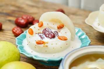 牛奶炖梨口味醇香甘甜,营养丰富,注意适当食用。