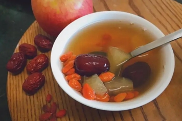 苹果红枣枸杞茶中苹果、枸杞味甘,性平,入中焦;红枣味甘,性温,入心经。苹果红枣枸杞茶具有理气和中、养血安神的功效。