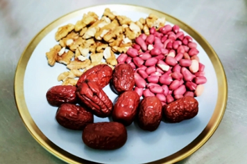 红枣味甘,性温,花生味甘,性平,二者均可归脾经且能补气。因此红枣花生核桃在一起可以补脾益气,可用于缓解脾虚食少、乏力便溏等病症。