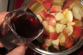 苹果去核切片放入锅中,倒入红酒,煮15分钟,出锅后即可食用。