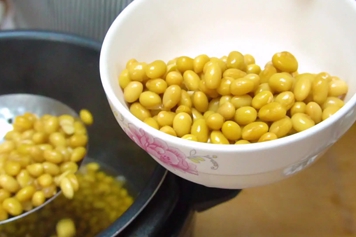 将黄豆洗净,放入锅内隔水蒸制,待黄豆熟后加入配料即可食用。