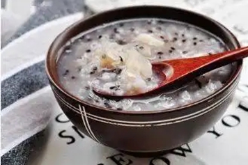 取适量芝麻、大米等食材洗净,再一同放入锅中,并加入适量清水,熬煮40分钟左右,放温后即可食用。