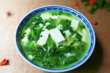 优质的豆腐富有弹性,结构均匀,质地嫩滑,形状完整。劣质的豆腐比较粗糙,摸上去没有弹性,而且略有发黏,故在制作茼蒿豆腐前注意甄别。