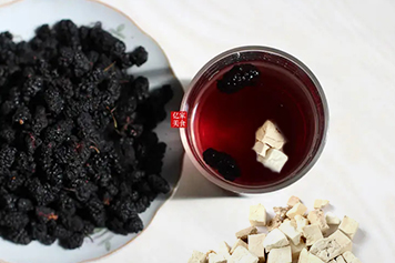 茯苓味甘、淡,性平,归心、脾、肺、肾经;桑葚味甘、酸,性寒,归心、肝、肾经。茯苓和桑葚泡水具有利水消肿、养肝益肾、补血安神等功效。
