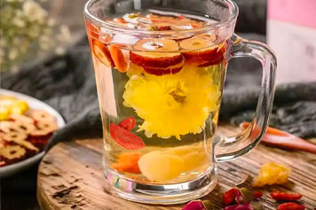红枣味甘、性温,入脾、胃、心经;枸杞味甘,性平,归肝、肾经;桂圆味甘,性温,归心、脾经;菊花味甘、苦,性微寒,归肺、肝经,红枣枸杞桂圆菊花泡水喝具有补脾益气、安神等功效。