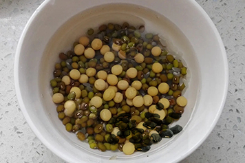 取适量黑豆、黄豆、绿豆,洗净后,放入锅中,加入清水煮至软烂,即可饮用。