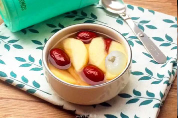 取适量桂圆、红枣、苹果放入容器中,加入沸水冲泡,待温度降至适宜后,即可饮用。
