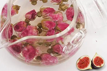 玫瑰花气芳香浓郁,味微苦涩,无花果果肉酥软且无核,味道甘甜。玫瑰花无花果茶具有补充营养、促进消化、行气解郁的功效。