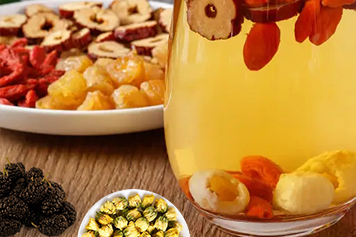 桑葚甘酸,可滋补阴血;大枣能养心血、安心神;桂圆能益气血、安心神,既不滋腻,又不壅滞,为滋补良药。故桑葚菊花枸杞大枣桂圆泡水喝有养血安神的功效,可用于改善血虚萎黄、精神恍惚、心中烦乱、健忘失眠等病症。