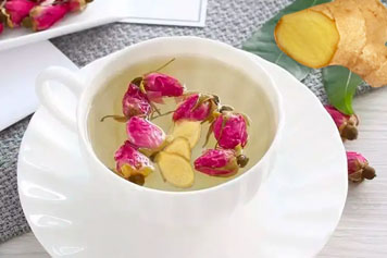 生姜辛散温通,能温胃散寒,和中降逆,止呕功良;玫瑰花味甘、微苦,可消食和胃,降逆止呕。故生姜玫瑰花茶具有温中止呕的功效,可用于食少呕恶、胃寒呕吐等症。