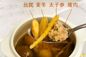 太子参味甘,入脾、胃经,既能补脾气,又能养胃阴;北芪味甘入脾经,为补益脾气之要药;瘦肉甘咸,入脾、胃经,也可益气健脾。因此太子参北芪麦冬瘦肉汤具有益气健脾的功效,可用于脾气亏虚引起的食少纳差等症。