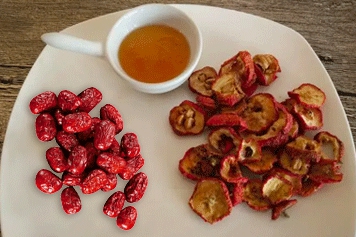 山楂干和红枣均味甘,性温,以山楂干和红枣泡水具有调和脾胃、益气养血的功效。