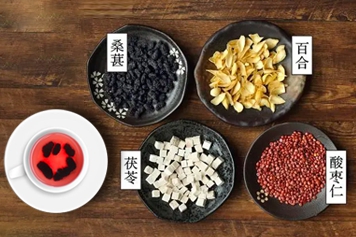 酸枣仁味甘入心经,可养心安神;茯苓味甘入心、脾经,可补益心脾而宁心安神;桑葚味甘入心经,可补心血、安心神;百合味甘入心经,能宁心安神。因此,酸枣仁茯苓桑葚百合一起煮水喝具有宁心安神的功效,可用于缓解虚烦不眠、惊悸多梦等症。