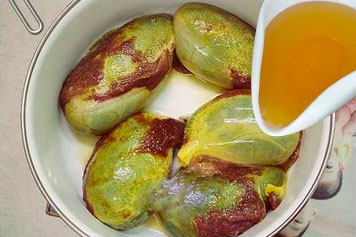 将新鲜的猪苦胆用凉开水清洗干净,再把猪苦胆切开取汁装入杯中,加入适量蜂蜜和开水进行搅拌,即可服用。
