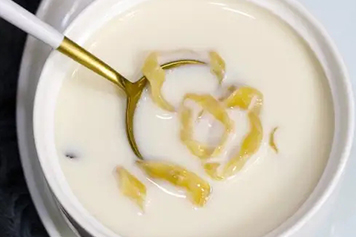 取适量鱼胶放入锅中加清水炖煮,煮沸后放入牛奶、冰糖继续炖煮10分钟,晾凉后即可取出食用。