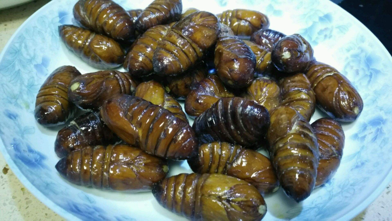 蚕蛹需先在沸水中煮15分钟再烹炒、油炸。蚕蛹与韭菜同炒,对高血脂、高血压、阳痿、便秘等疾病有一定的食疗作用。