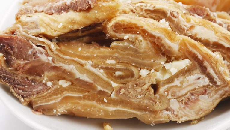 牛筋可炒、拌、炖、卤,老少皆宜。新鲜的牛筋清洗后可烹制食用,干牛筋需在水中浸泡后再烹制,且需长时间蒸或炖,否则不宜咬动。