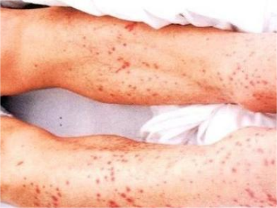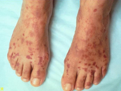 累及肾脏时可出现蛋白尿、血尿、脓尿等,少数患者可同时出现皮肤损害,表现为紫癜瘀斑、坏死性溃疡、丘疹等,常侵犯下肢,其次是上肢。