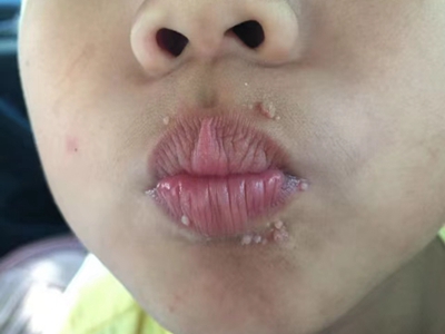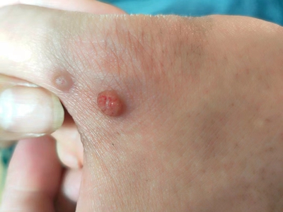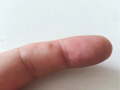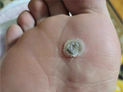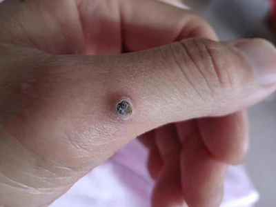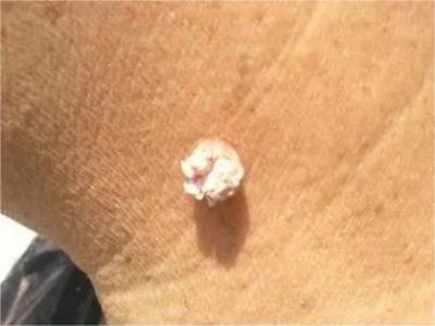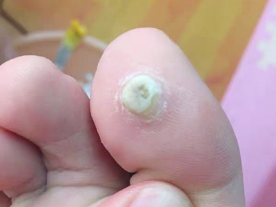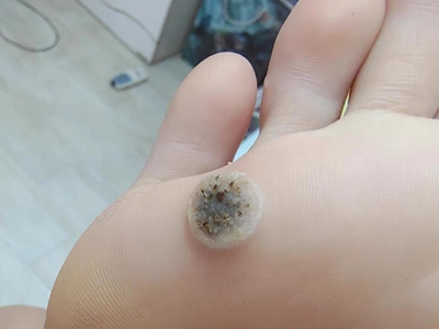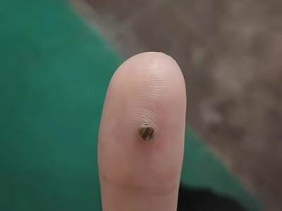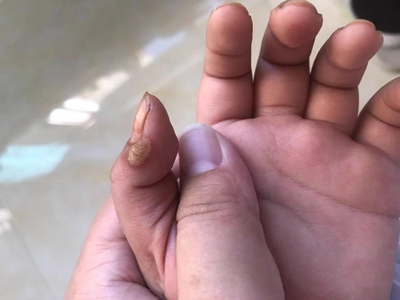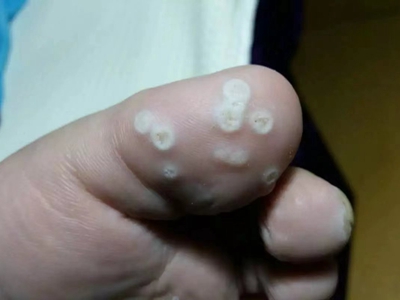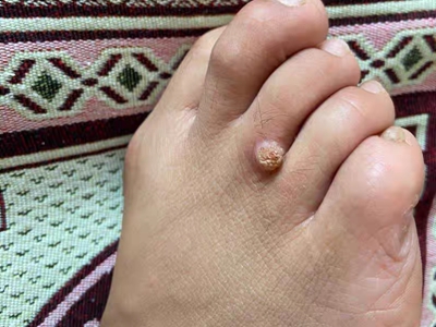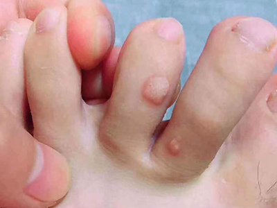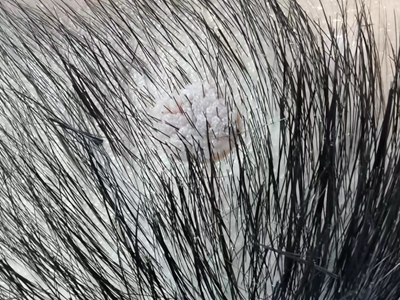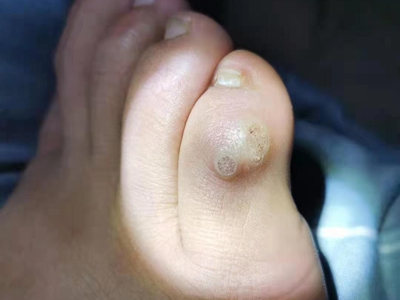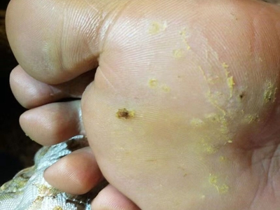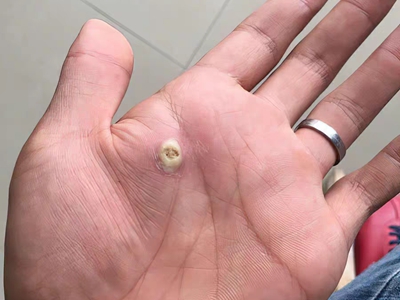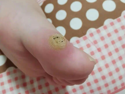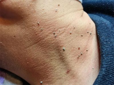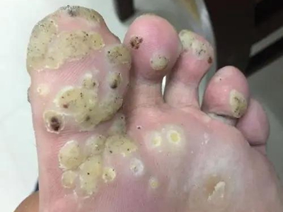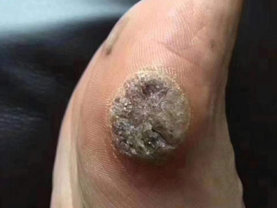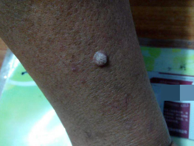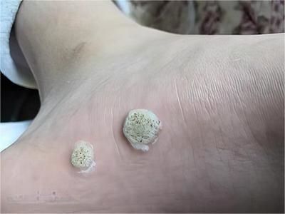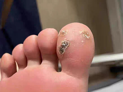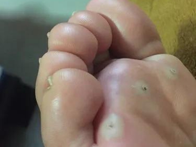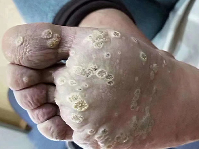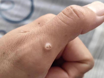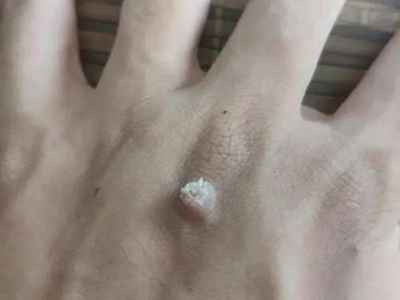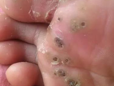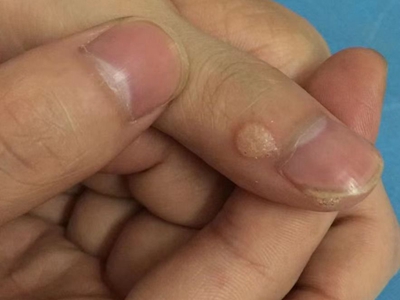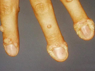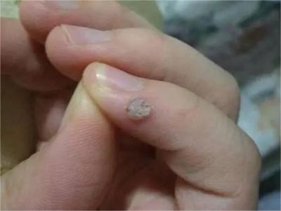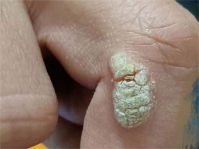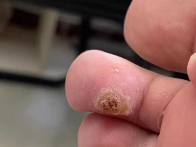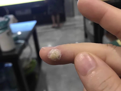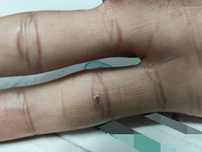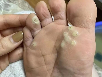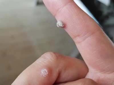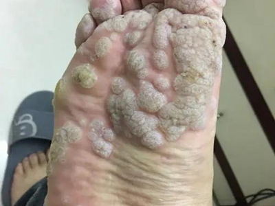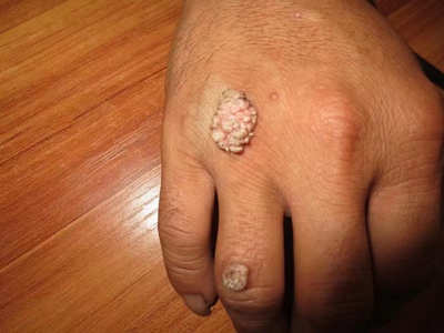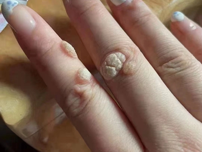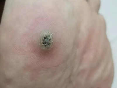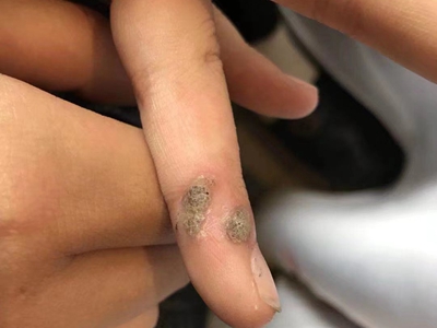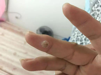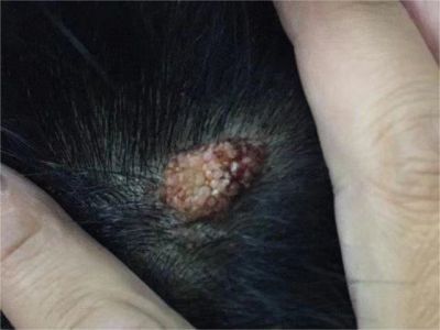 寻常疣患者可见头皮处长细长肉条,疣体表面有参差不齐的突起,整体皮损为豆粒大小,由几个指状突起聚集而成,疣体质地较柔软,顶端有角质物相对较硬,基部较细而呈蒂状。