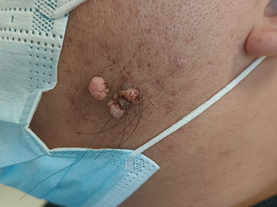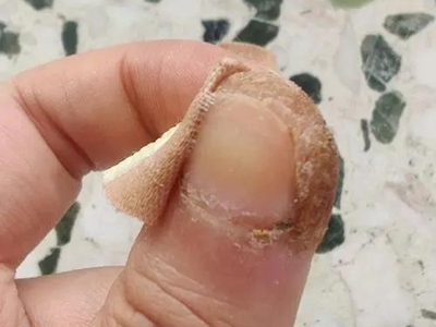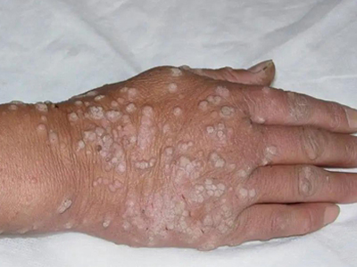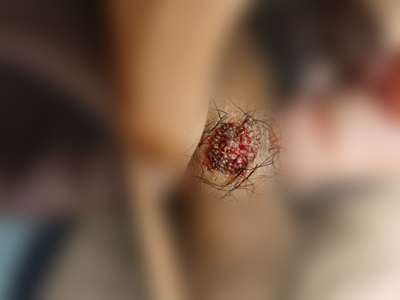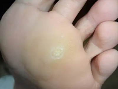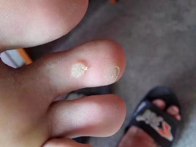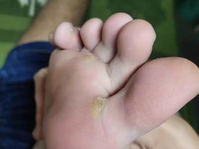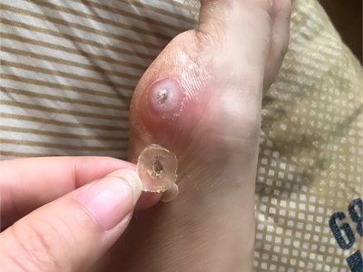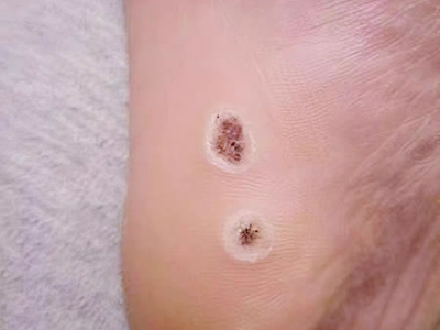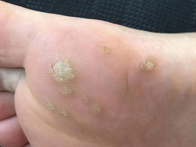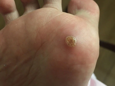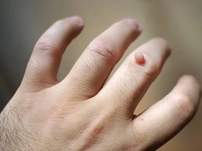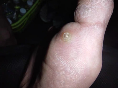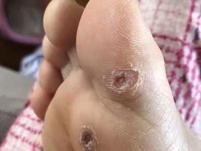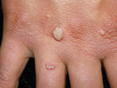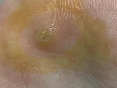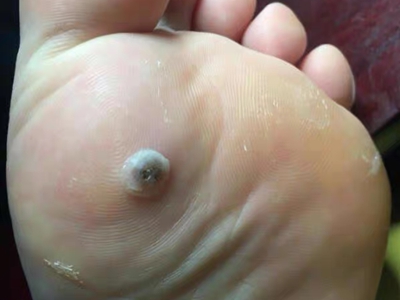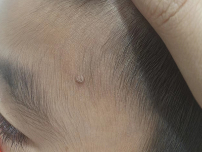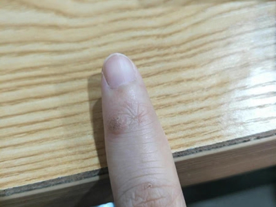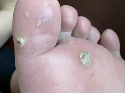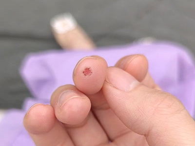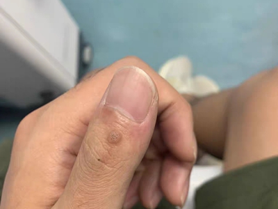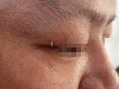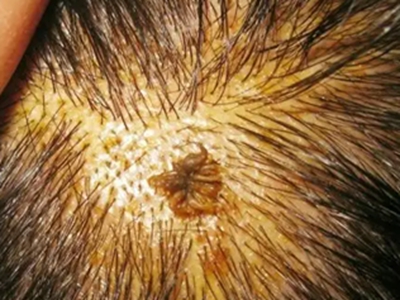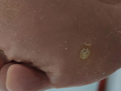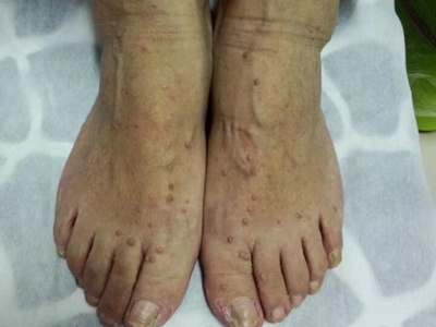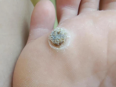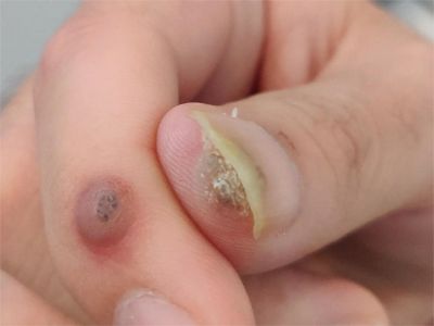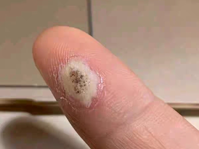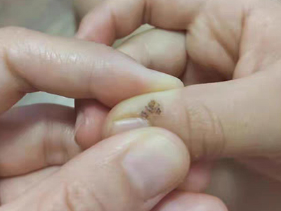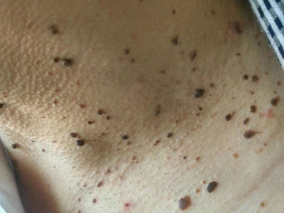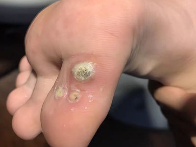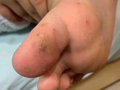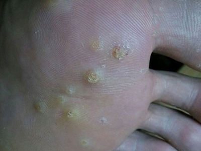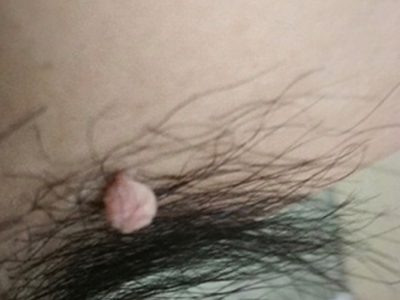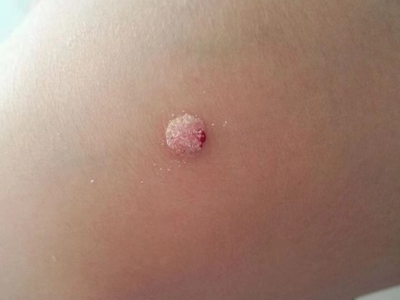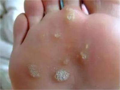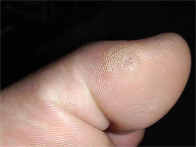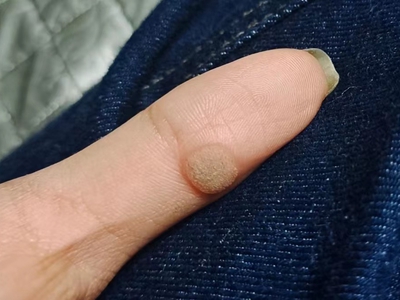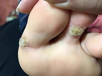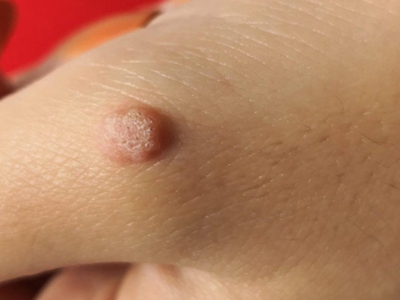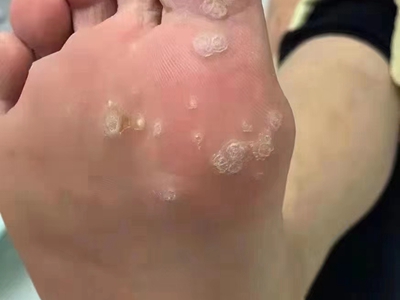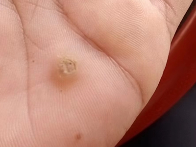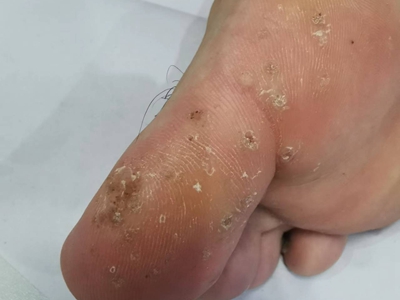 寻常疣患者可见头皮处长细长肉条,疣体表面有参差不齐的突起,整体皮损为豆粒大小,由几个指状突起聚集而成,疣体质地较柔软,顶端有角质物相对较硬,基部较细而呈蒂状。