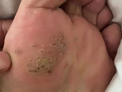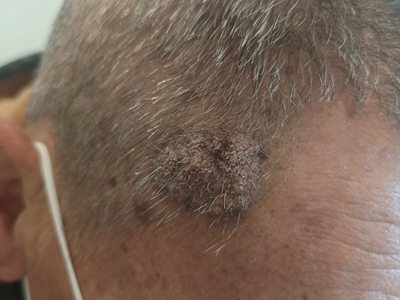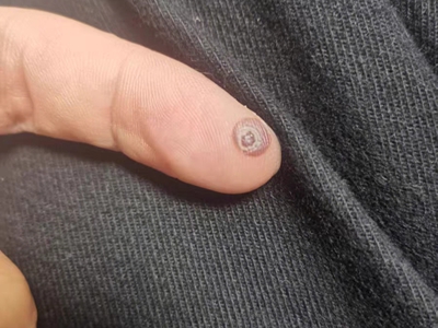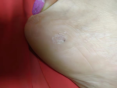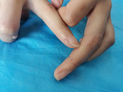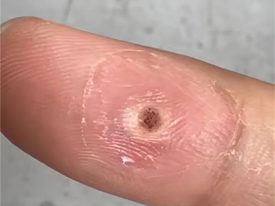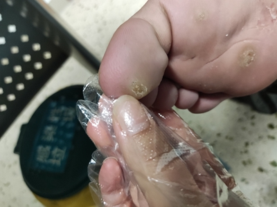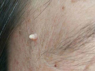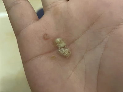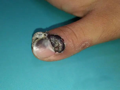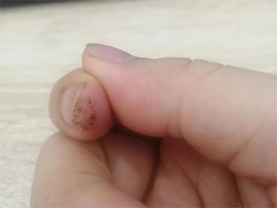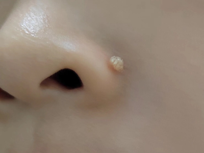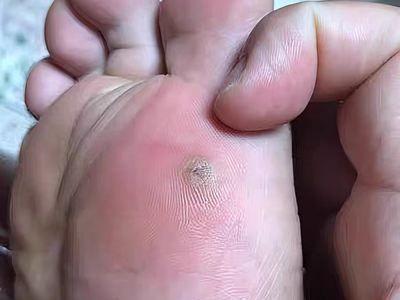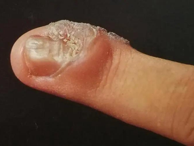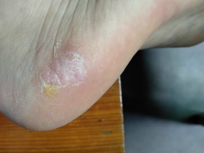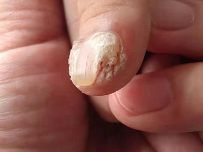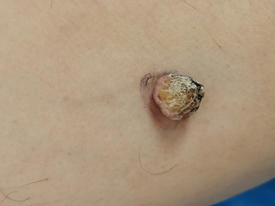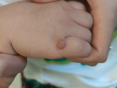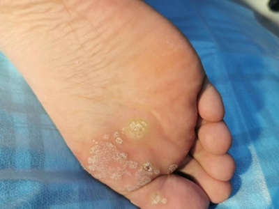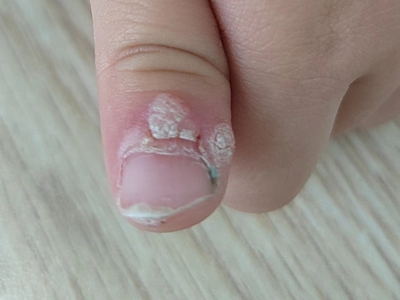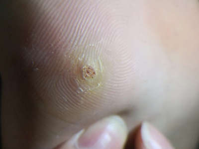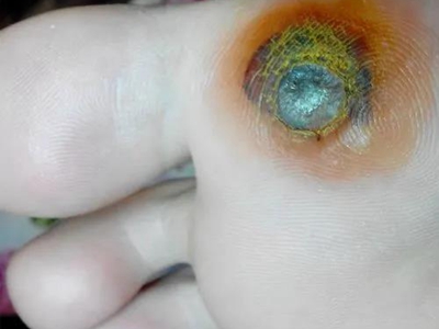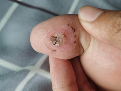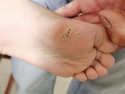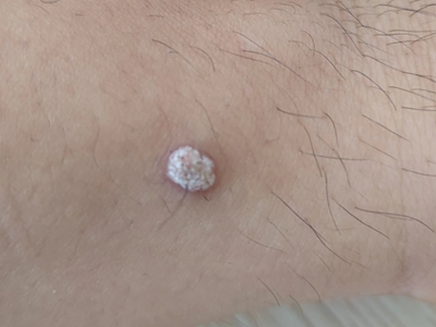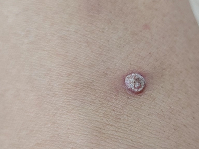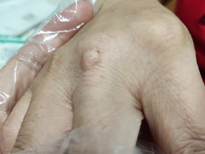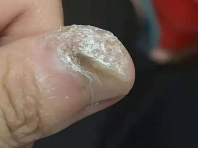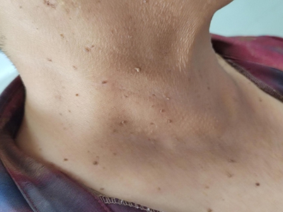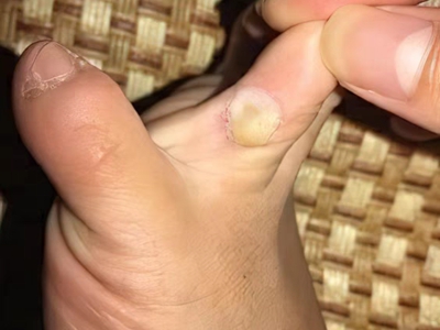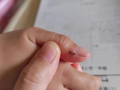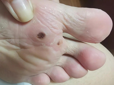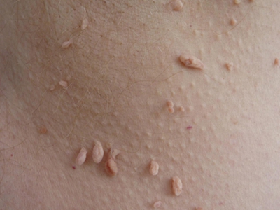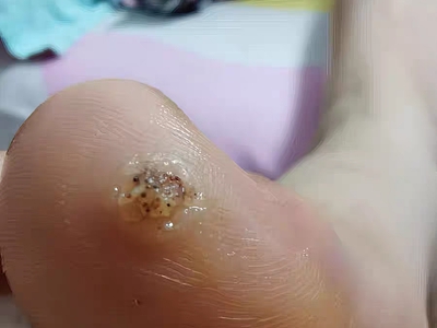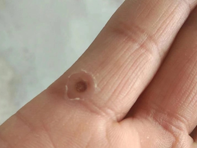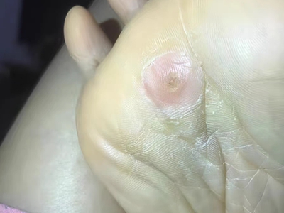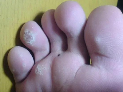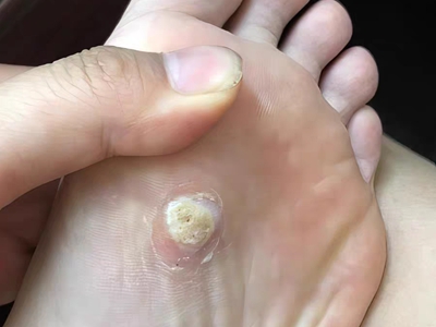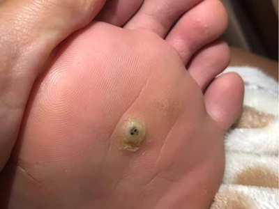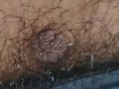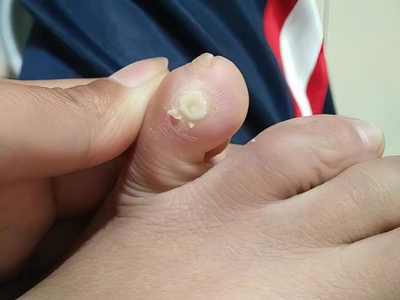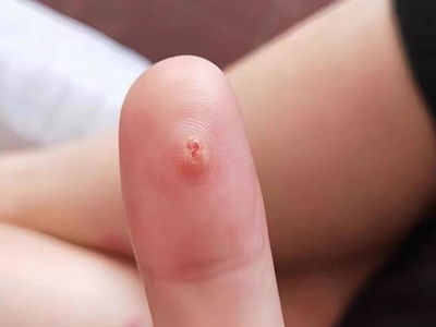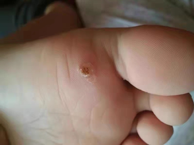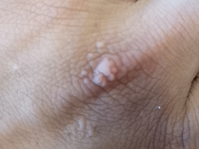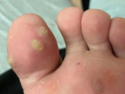 寻常疣患者可见头皮处长细长肉条,疣体表面有参差不齐的突起,整体皮损为豆粒大小,由几个指状突起聚集而成,疣体质地较柔软,顶端有角质物相对较硬,基部较细而呈蒂状。