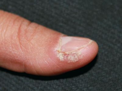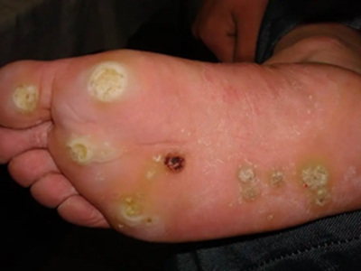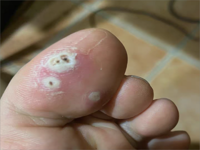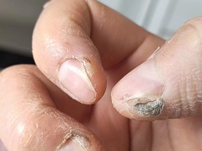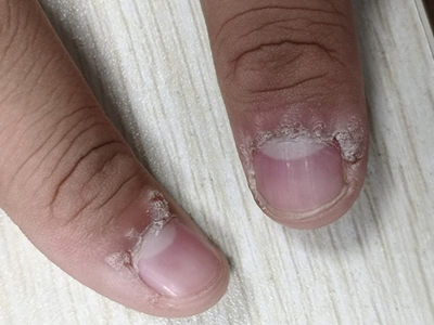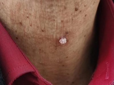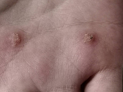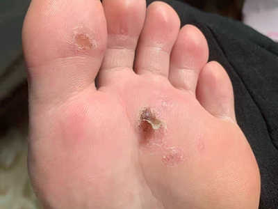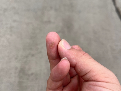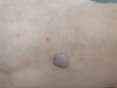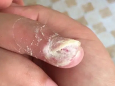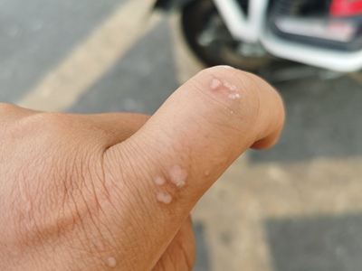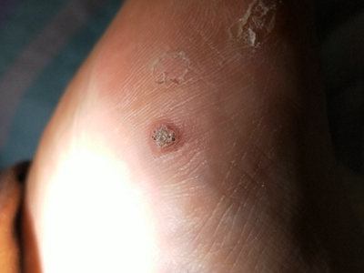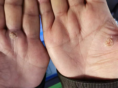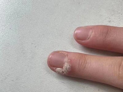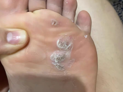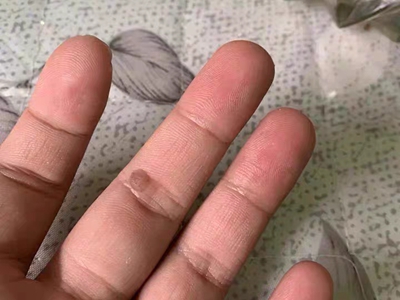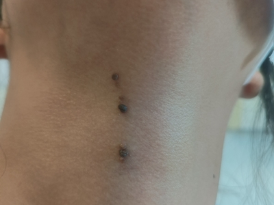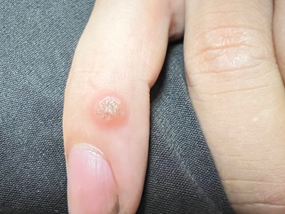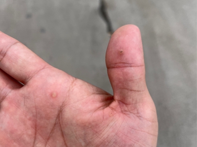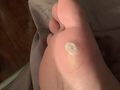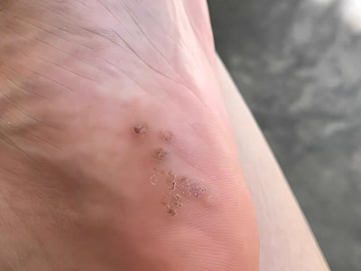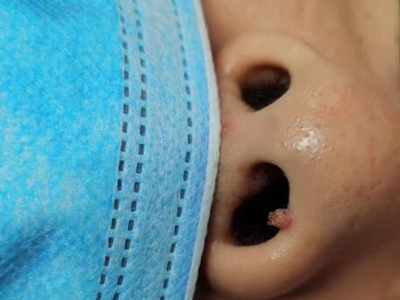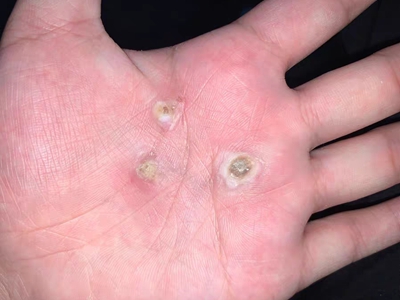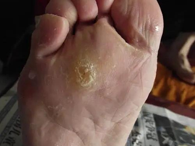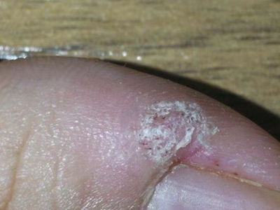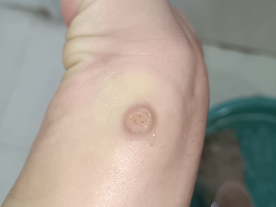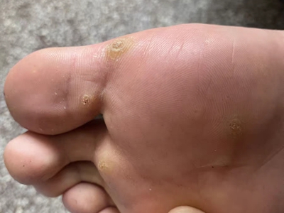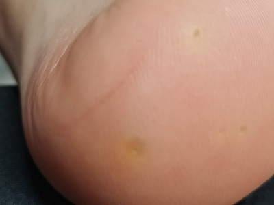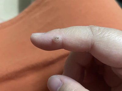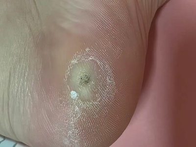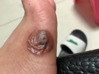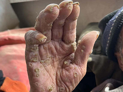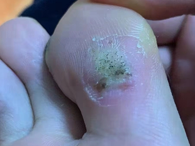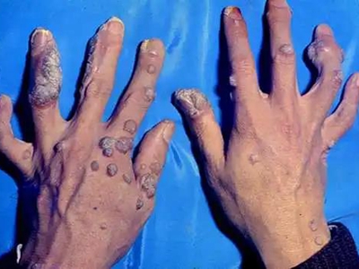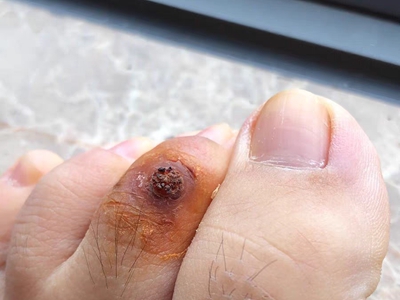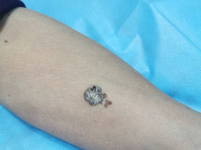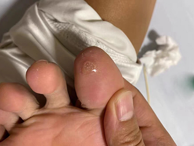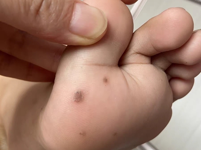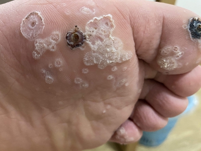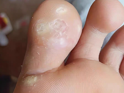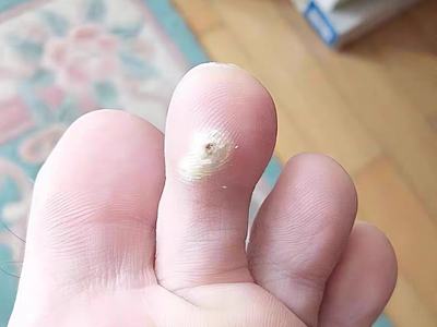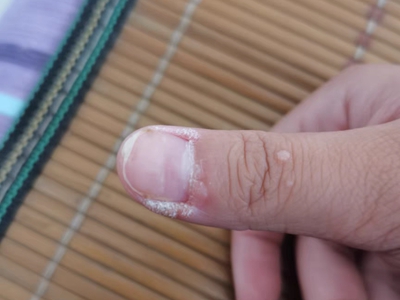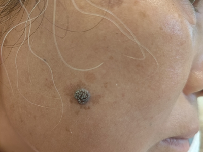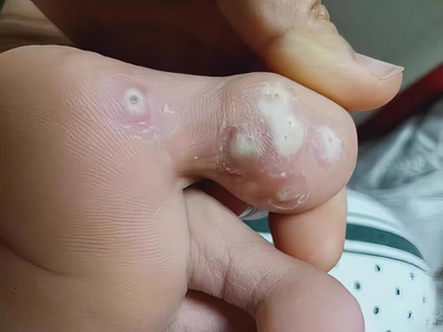 寻常疣患者可见头皮处长细长肉条,疣体表面有参差不齐的突起,整体皮损为豆粒大小,由几个指状突起聚集而成,疣体质地较柔软,顶端有角质物相对较硬,基部较细而呈蒂状。
