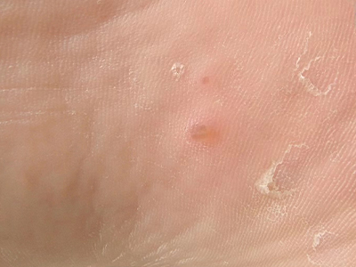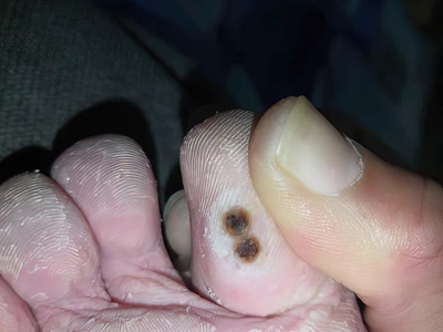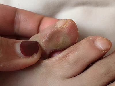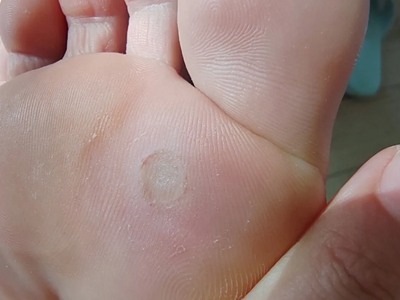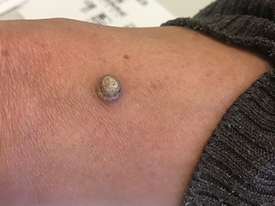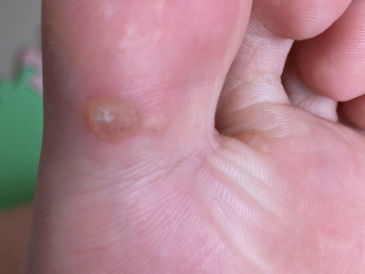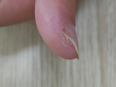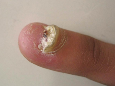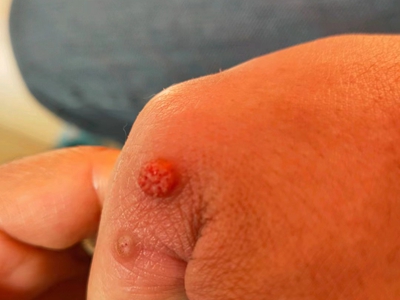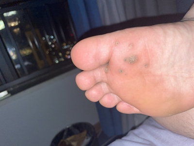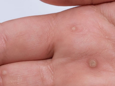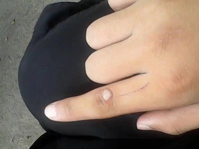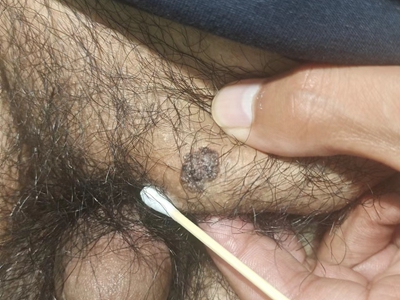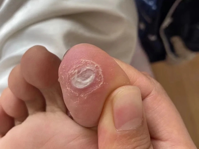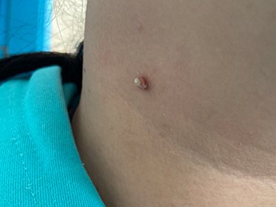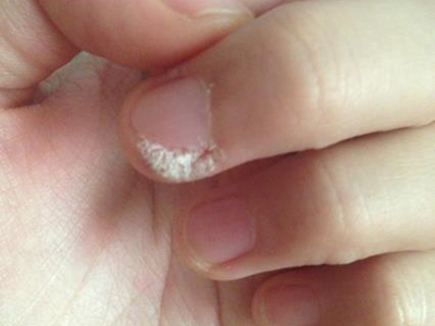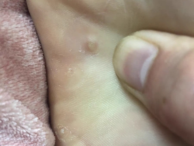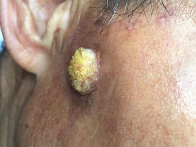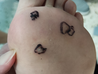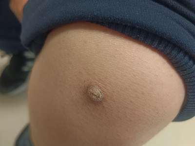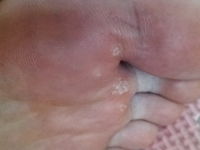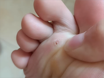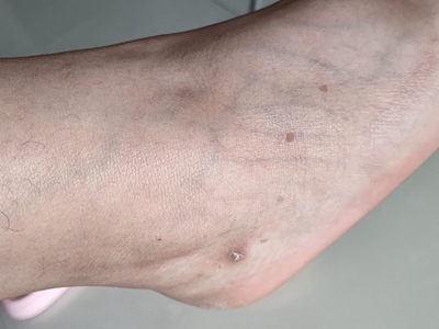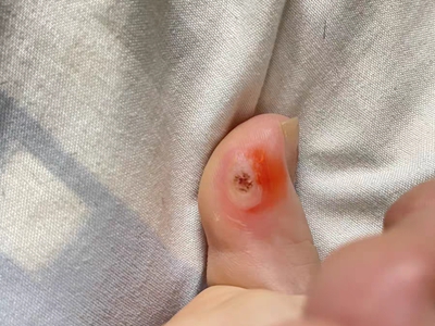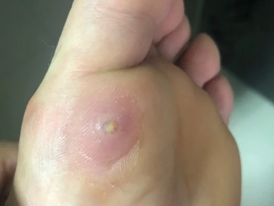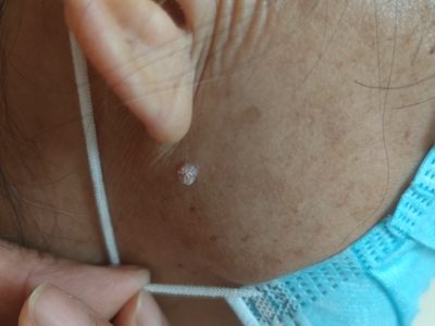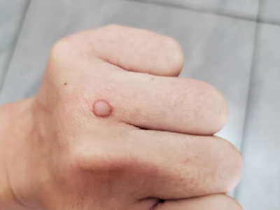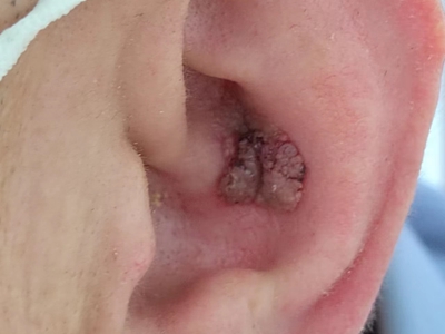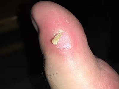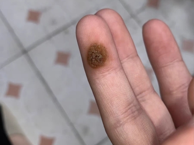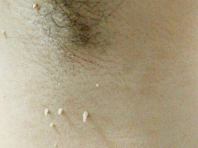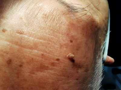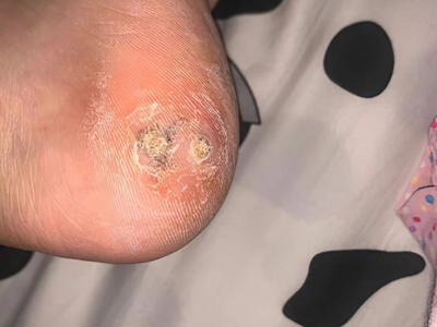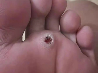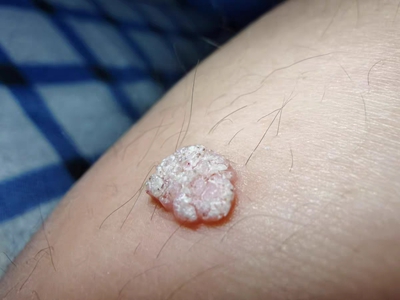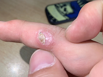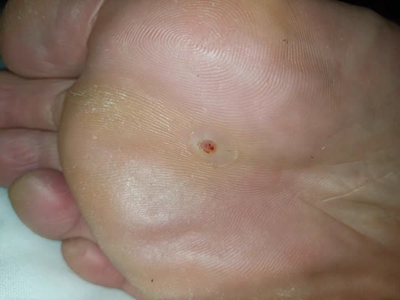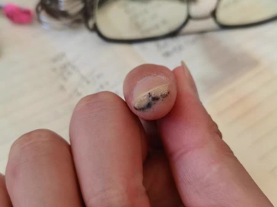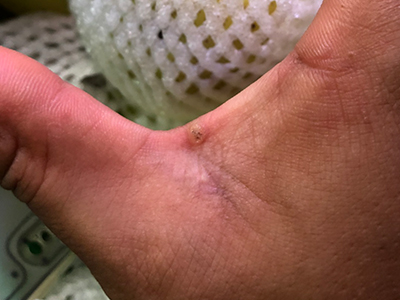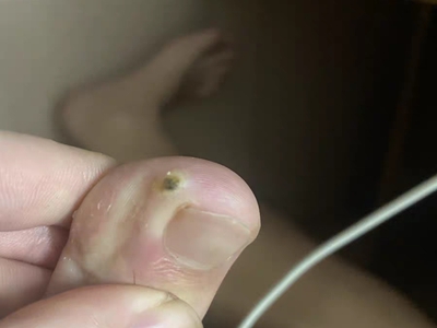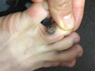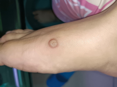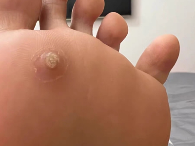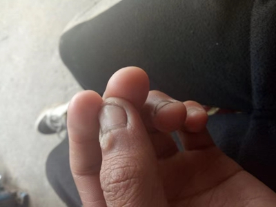 寻常疣患者可见头皮处长细长肉条,疣体表面有参差不齐的突起,整体皮损为豆粒大小,由几个指状突起聚集而成,疣体质地较柔软,顶端有角质物相对较硬,基部较细而呈蒂状。