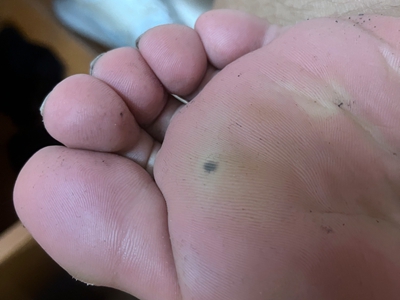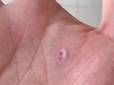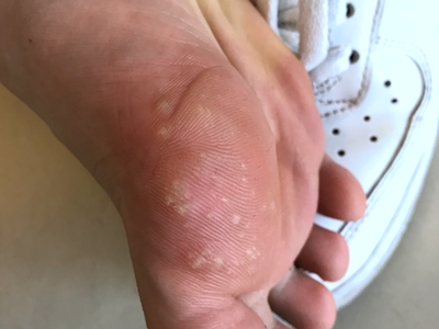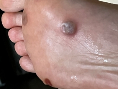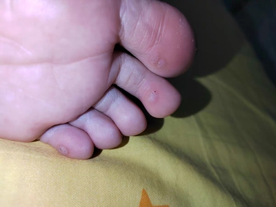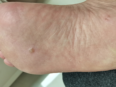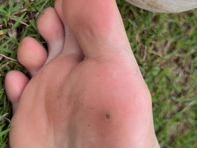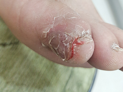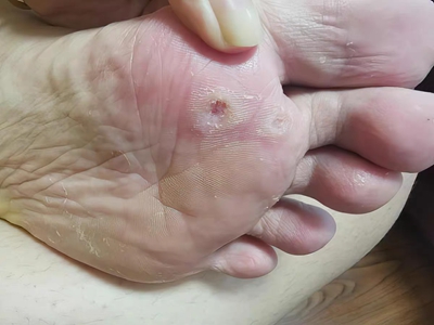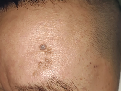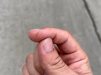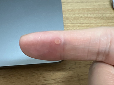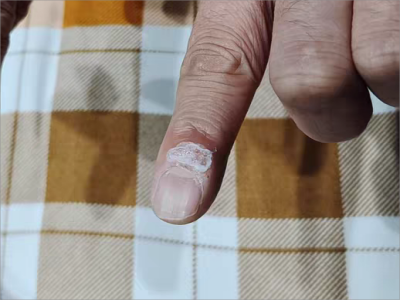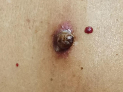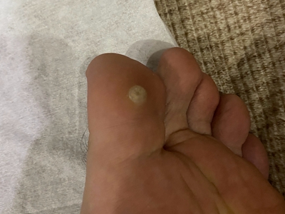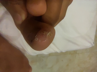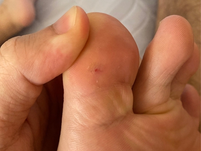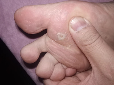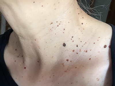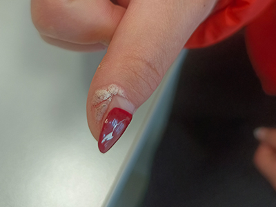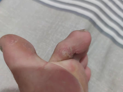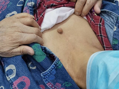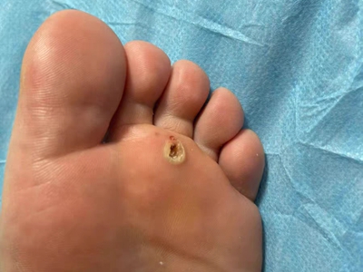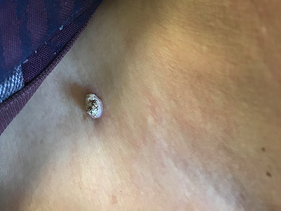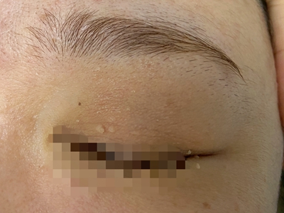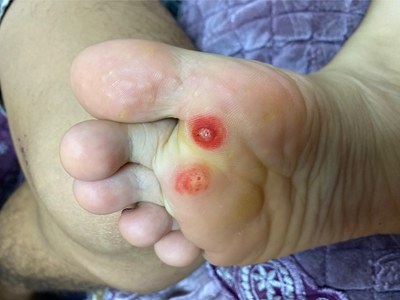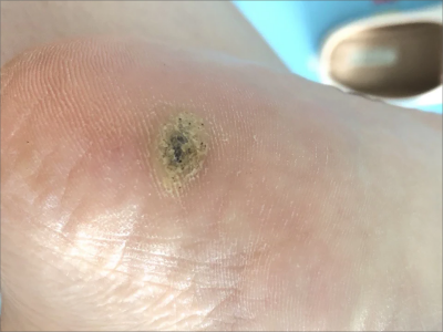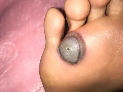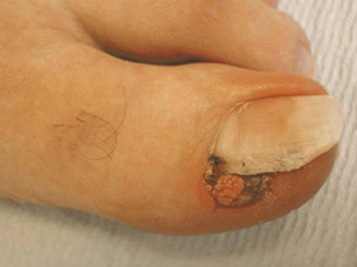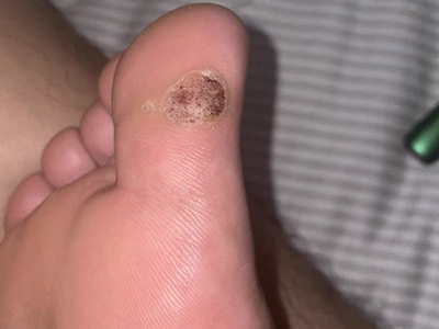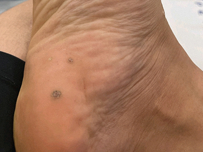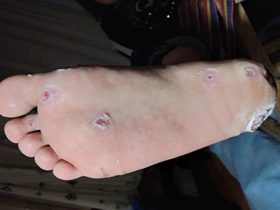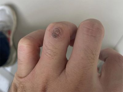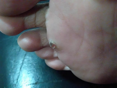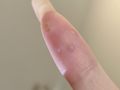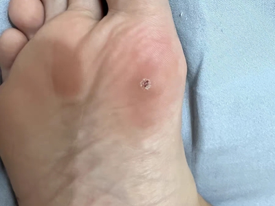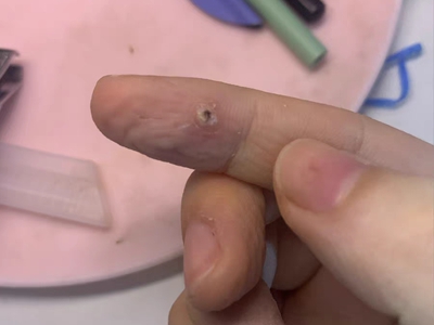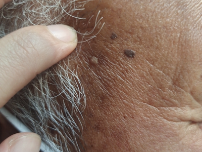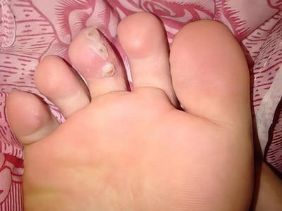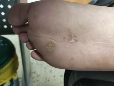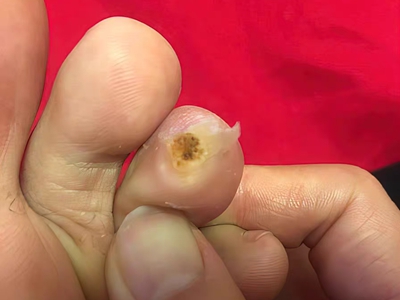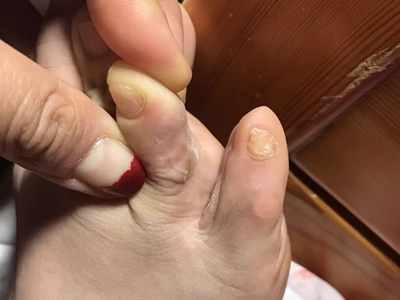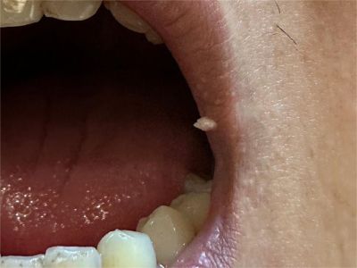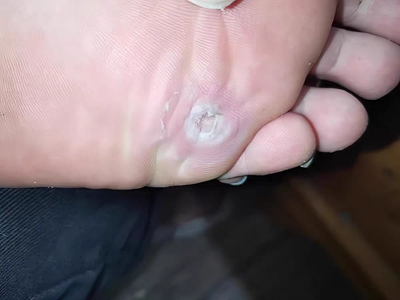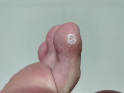 寻常疣患者可见头皮处长细长肉条,疣体表面有参差不齐的突起,整体皮损为豆粒大小,由几个指状突起聚集而成,疣体质地较柔软,顶端有角质物相对较硬,基部较细而呈蒂状。
