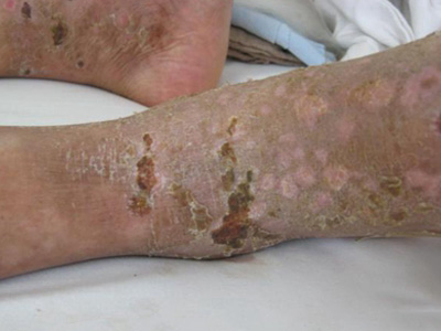 疱疹样皮炎在大腿上出现一大片红色皮疹,皮疹呈对称性、多形性分布,整个病损为地图形,患者瘙痒明显,在挠抓后发生破溃,表面为局部有暗红色结痂。