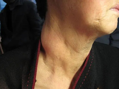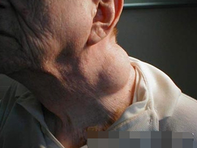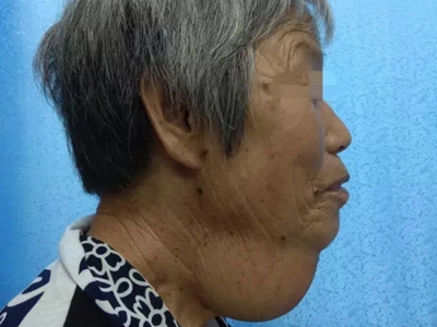 脂肪瘤患者脖子周围出现大包块,形状不规则,皮肤表面光滑,从侧面看患者脖子与下巴处于同一平面。当包块压迫气管时,可能出现呼吸困难等症状。