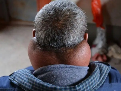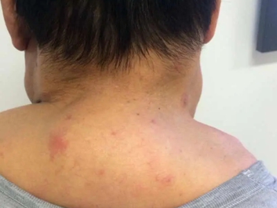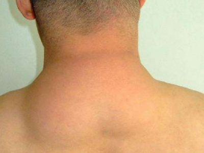 脂肪瘤患者脖子两侧出现对称性的包块,向上蔓延至头发区域,看上去像一个围脖一样,中间形成一个向内的凹陷,症状比较严重,建议患者及时就医。