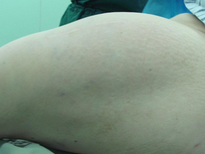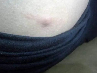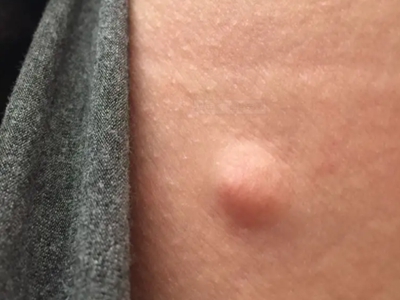 脂肪瘤患者大腿上有一个小结节,明显突出于正常的皮肤表面,形状呈圆形,大小如花生米,顶端有轻微的发红,多数患者不伴随自觉症状。