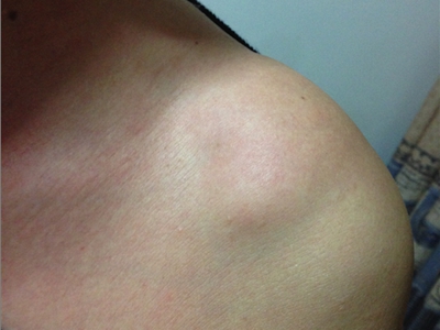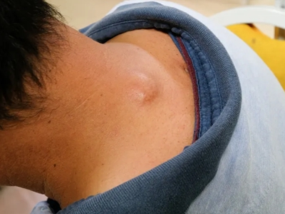 脂肪瘤患者左侧肩膀部位出现一个隆起的大包,与周围皮肤的边界并不是很清晰,外观看上去像发面馒头一样,用手触摸质地柔软,不伴随有自觉症状。