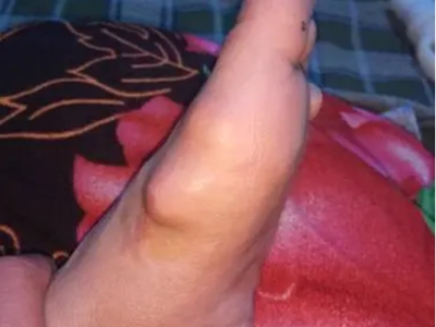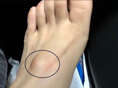 脂肪瘤患者左侧脚内侧靠近大拇趾位置,有一个突起的包块,形状像个小山丘,表面光滑,包块质地柔软,生长缓慢,无红肿、疼痛等症状。