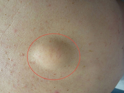 脂肪瘤患者脖子正后方长有单独的圆疙瘩,高出皮面,外观呈半球状,直径有1厘米左右,看上去像鹌鹑蛋一样,表面与周围正常皮肤呈相同颜色。