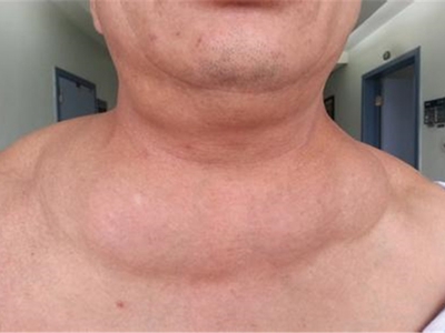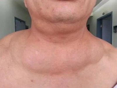 脂肪瘤患者脖子下面有不规则包块,看上去脖子明显增粗一圈,与患者下巴几乎处于同一平面,表面皮肤张力较高并且光滑,质地柔软,需手术治疗。