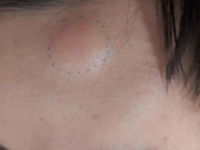 脂肪瘤患者脸上有一个明显隆起的肿块,呈椭圆形,正常肤色,表面皮肤完整,边缘不规则,但与周围组织边界清晰,患者无不适症状。
