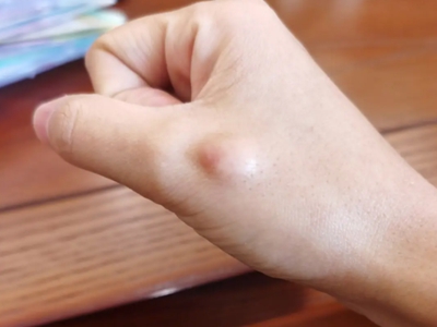 脂肪瘤患者右手手腕出现一个小疙瘩,用手按压质地柔软,与周围皮肤存在明显的界限,手指轻推会与轻微移动,按压可以压平,但是松压后会恢复原样。
