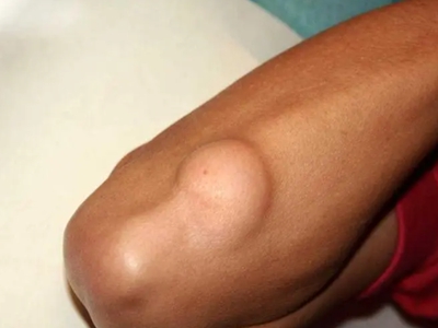 脂肪瘤患者胳膊靠近肘部有一个光滑的大疙瘩,外观像鹅蛋一样隆突于皮肤表面,但是表皮颜色没有异常改变,触摸柔软、有弹性,生长缓慢。