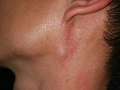 脂肪瘤患者左侧颈部靠近下颌的位置,有一个圆形的小疙瘩,表面凸起,有指甲盖大小,皮肤颜色没有明显异常,也没有瘙痒、疼痛等不适症状。