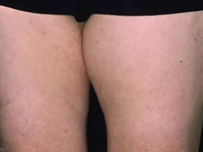脂肪瘤患者大腿上方长有一个大包,外观类似等边三角形,边长7厘米左右,表面毛发相对较少,用手进行触摸可感光滑,按压时质地较软。