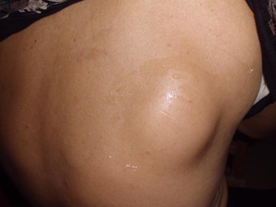 脂肪瘤患者肩膀靠近背部出现弥漫性肿大,并形成片状的大结节,形状并不规则,表面光滑,还有几个红色的小斑块,但是并不隆起,也不伴随不适症状。