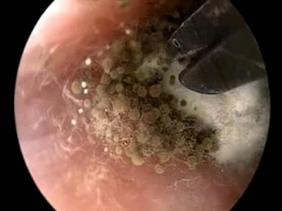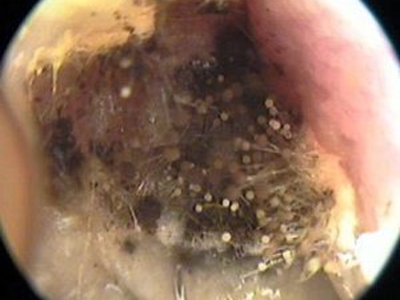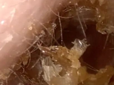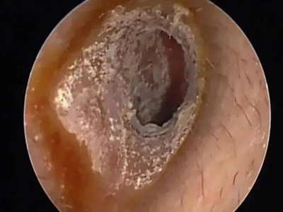 霉菌性外耳道炎患者的外耳道上附着有大量的干燥分泌物,呈圆形或花朵状,附着于耳朵上的茸毛上,外观形似蒲公英,并不断向内耳进行侵袭。