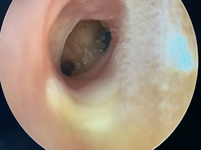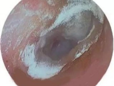 霉菌性外耳道炎患者的外耳道周围明显红肿,表面附着少许白色鳞屑,并在外耳道的深部有云雾状的白色团块,堵塞大部分外耳道,仅露出少许空隙。
