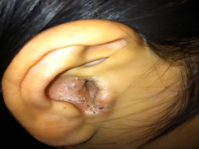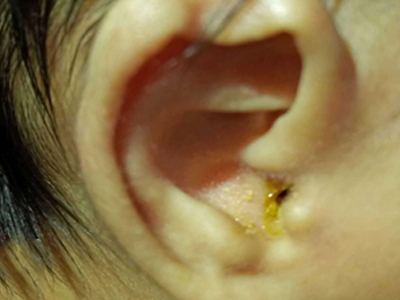 霉菌性外耳道炎患儿的右侧耳朵部位有半透明的脓性分泌物流出,并在耳朵外面靠近外耳道口处形成一圈黄色结痂,患儿可因耳朵瘙痒不断搔抓。