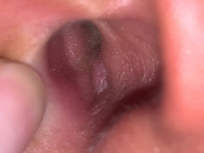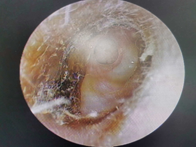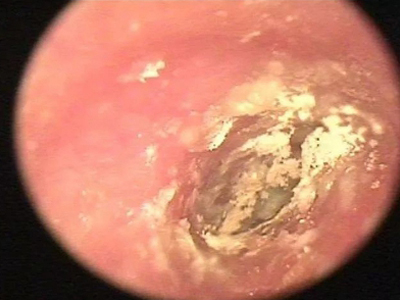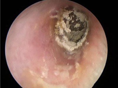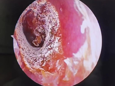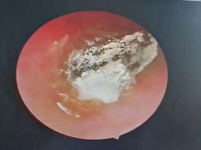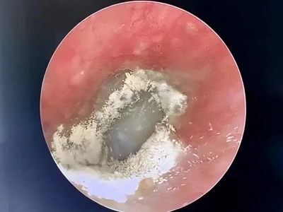 霉菌性外耳道炎患者的外耳道周围红肿,外耳道壁及鼓膜上有大量灰白色脓液性分泌物,表面凹凸不平,有许多的疣状凸起,堵塞大部分耳道。