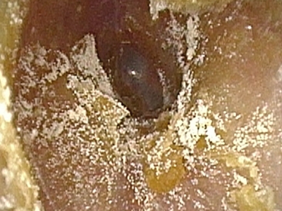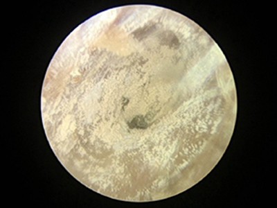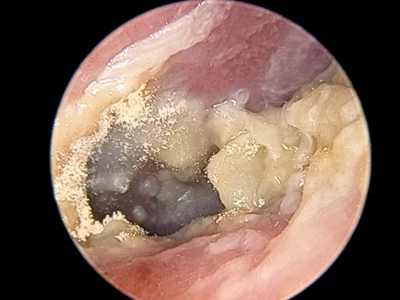 霉菌性外耳道炎患者的外耳道上有一大块厚厚的黄色鳞屑,表面呈颗粒状,边缘破碎不齐,并且与外耳道黏膜连接紧密,周围有少许斑点状鳞屑,并向外耳道深处进行蔓延。