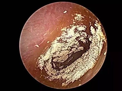 霉菌性外耳道炎患者的外耳道壁上附着有大量的干燥分泌物,并凝结成团块的黄色脓块,周围有密密麻麻的颗粒状白色鳞屑,部分相互融合成片。