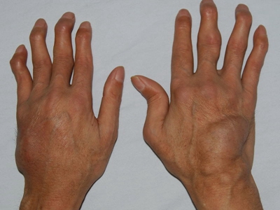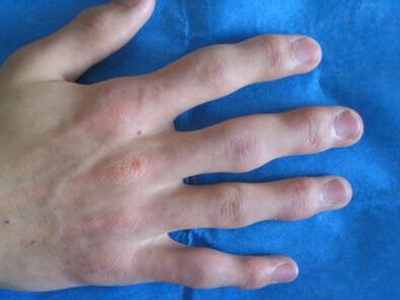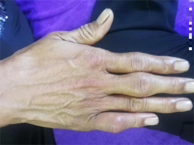 2、痛与压痛:手指关节痛往往是早期出现的症状,常出现的部位为腕、掌指关节、近端指间关节等。多呈对称性、持续性,但时轻时重,疼痛的关节往往伴有压痛,受累关节的皮肤出现褐色素沉着。