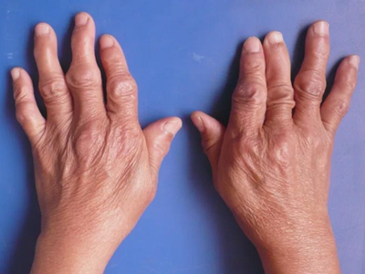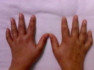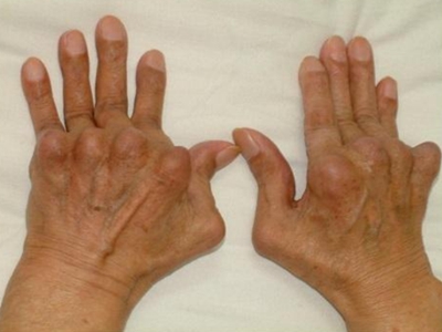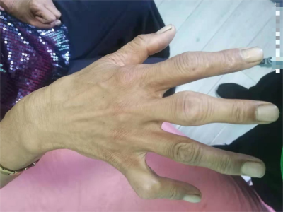 4、关节畸形:见于较晚期患者,关节周围肌肉的萎缩、痉挛则使畸形更为严重。常见的晚期关节畸形是手指向尺侧偏斜和呈“天鹅颈”样及“纽扣花”样表现。重症患者关节呈纤维性或骨性强直,失去关节功能,致使生活不能自理。